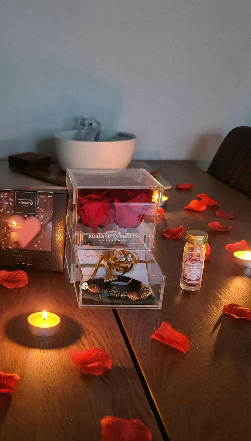 The acrylic box is filled with roses and has a special drawer to fit jewelry or pictures to remind them to their memories. These roses do not decay, unlike fresh roses.